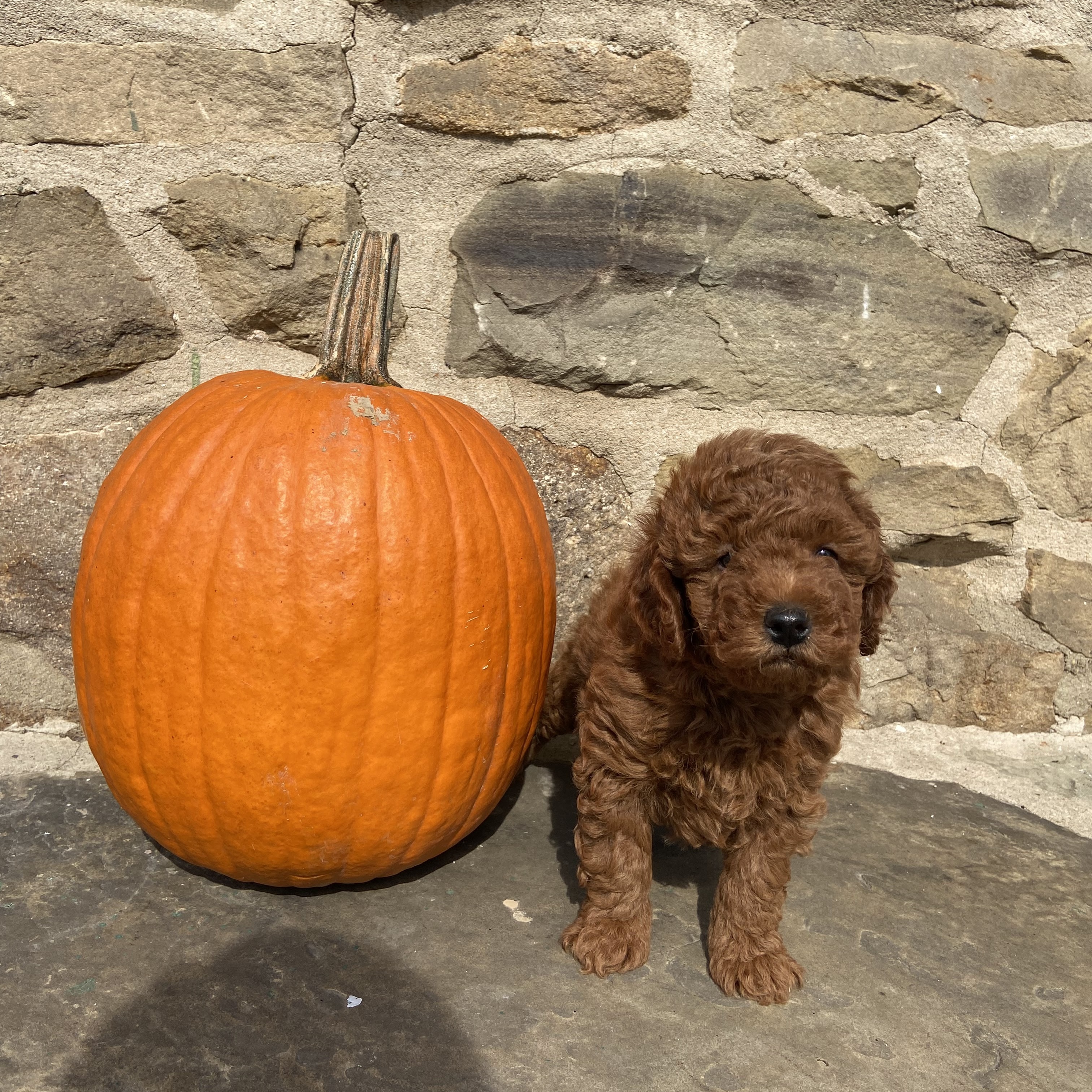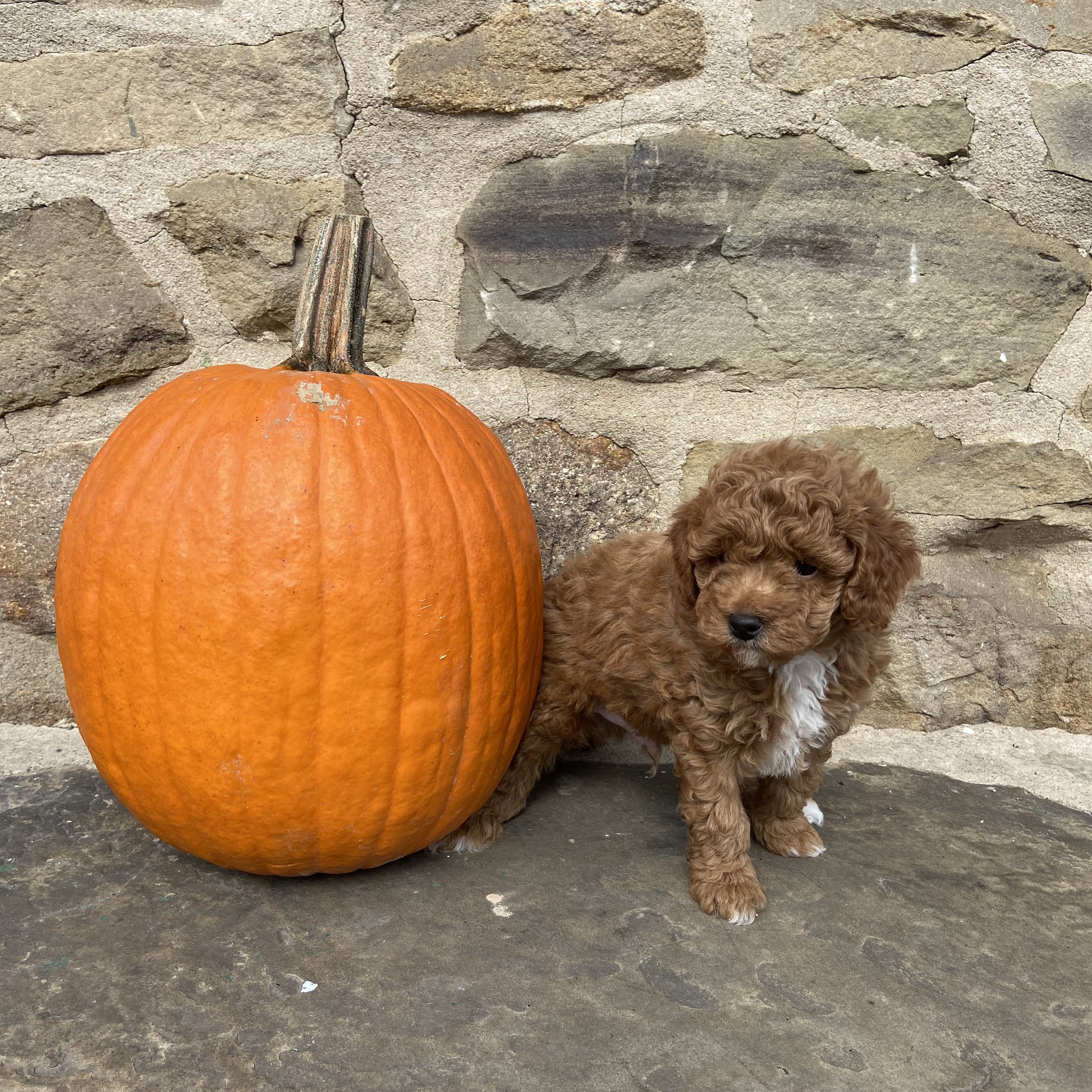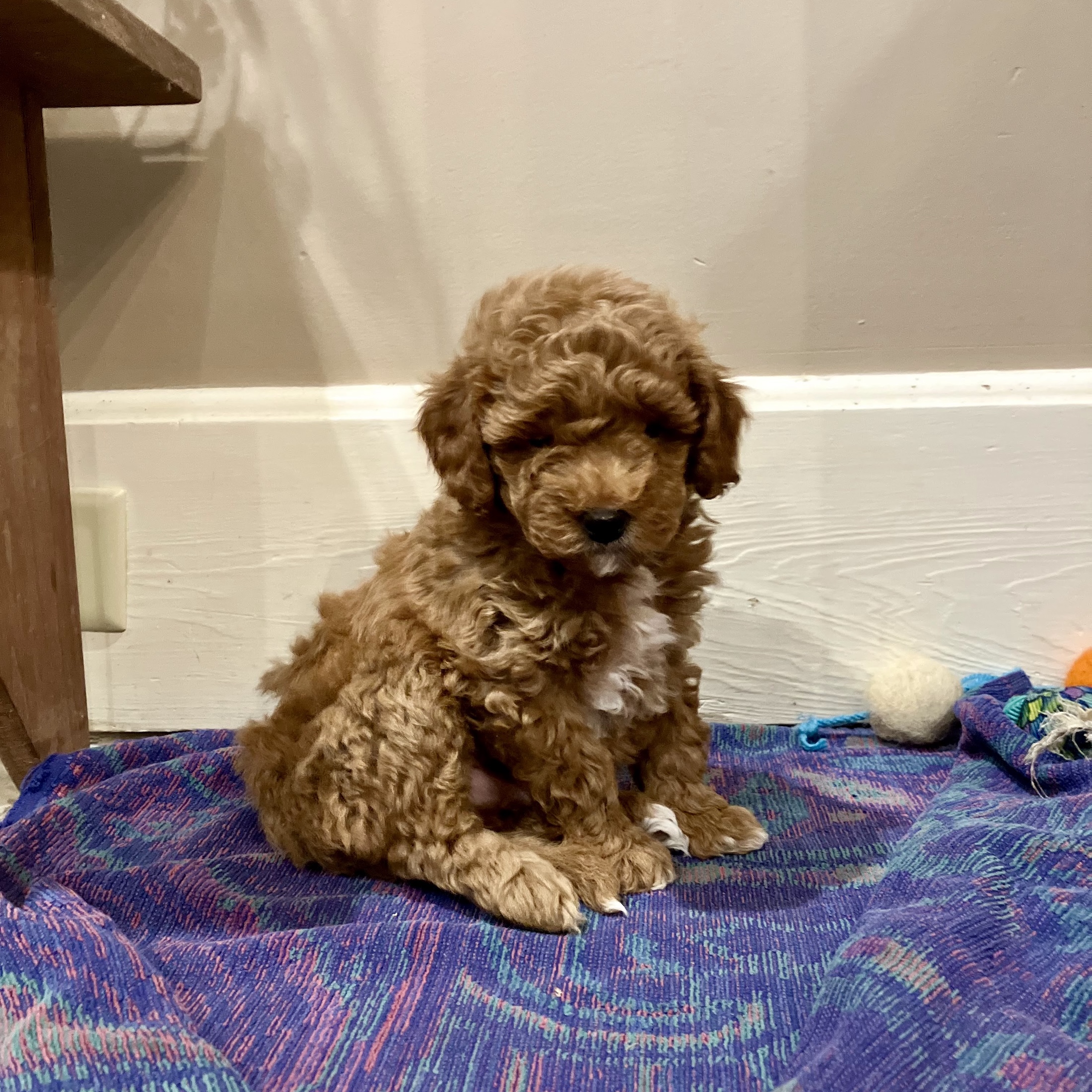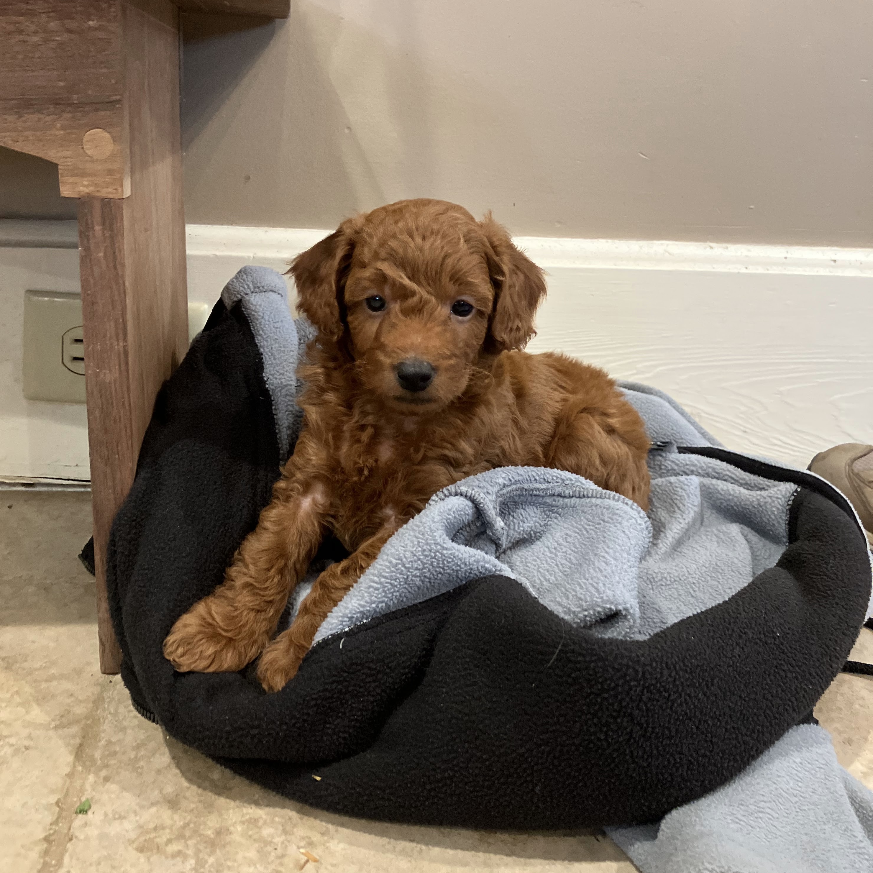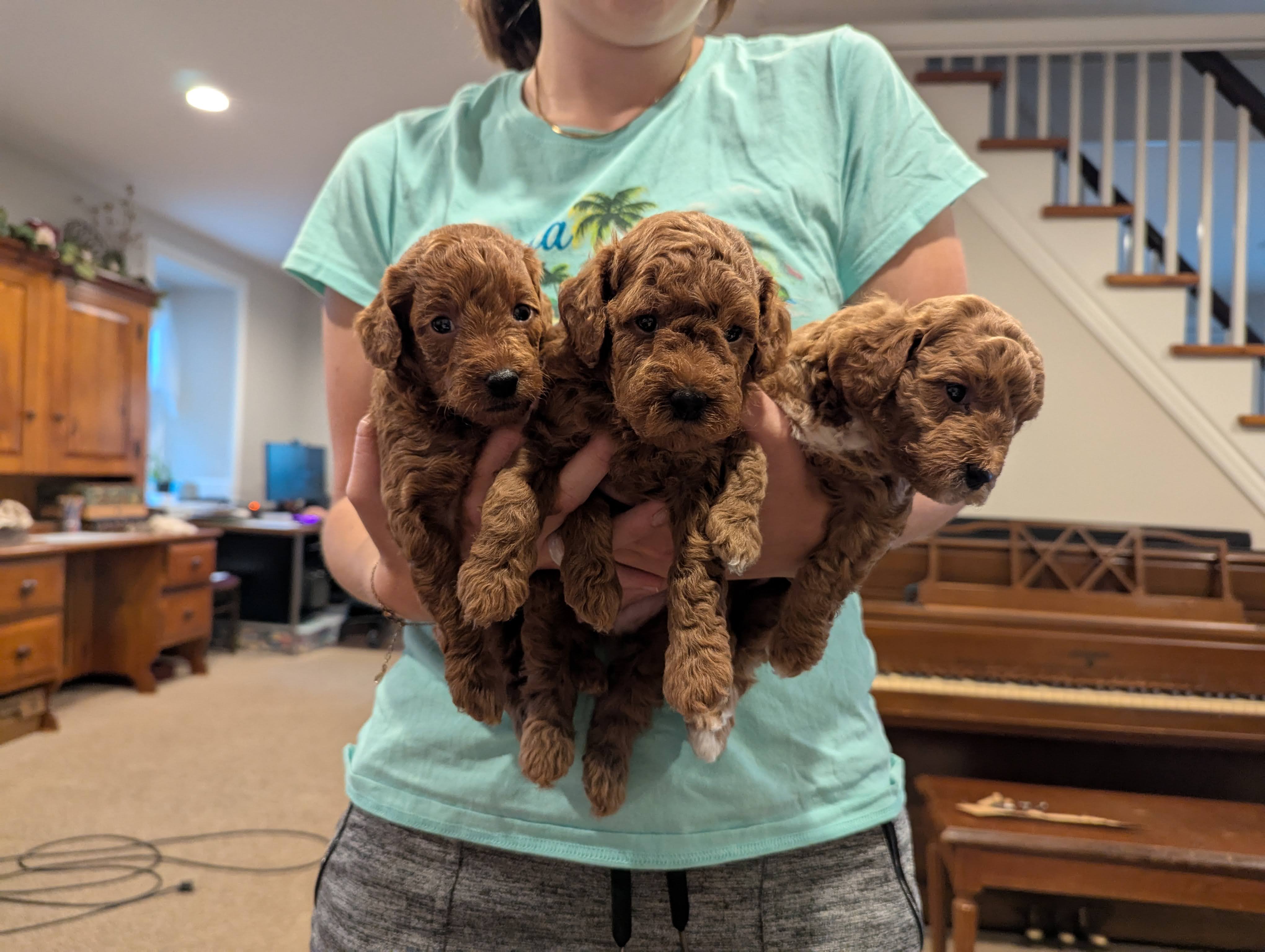 We are F1BB Mini Goldendoodles. We were born and raised in my mom's home with my siblings. We have full run of the kitchen and spend our time with my mom's family when not sleeping.